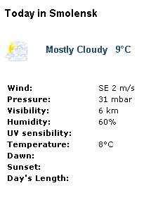 The condition of "fog" should have no bearing on this, but yet in researching screen grabs for Smolensk, there should not have been fog in the least in that area. Conditions were not 100% humidity, but as the information proves only 60%.Fog requires in normal circumstances 100% humidity to form. In the extended forecast in Russian no mass fog banks are noted. There was not snow on the ground for thermal inversions, no stagnant air masses, and the most damning evidence of all, the barometric readings were 31 inches which is a high reading.