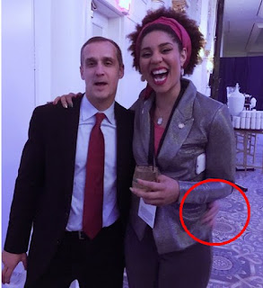 See the problem with this is the picture of Corey Lewandowski has his hand on this Afroid's hip. That is not ass, but hip bone and as this man sized Afroid was probably mistaken by Corey Lewandowski as that Afroid quarterback Colin Kapernick creature who is always protesting, Corey was probably just telling the shemazon to get back into the game as he thought this was an NFL player.
