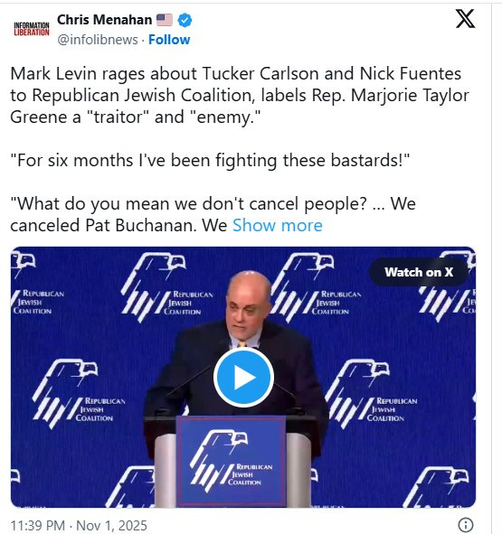 This is the same group who scoped out Charlie Kirk to threaten and terrorize him before Utah, and now they are taking up the terrorism against Tucker Carlson and people like him. The problem is not a communist who just overthrew Jew York City and has Jews fleeing for their lives with their little Jewettes. No the problem according to Mark Levin are the people who are friends of Charlie Kirk.