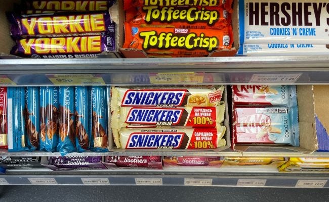 Meanwhile, Russian banned exports are flooding British stores as the English can get Russian Snickers bars, with Russian writing on them. I would like some of these as I like Snickers.