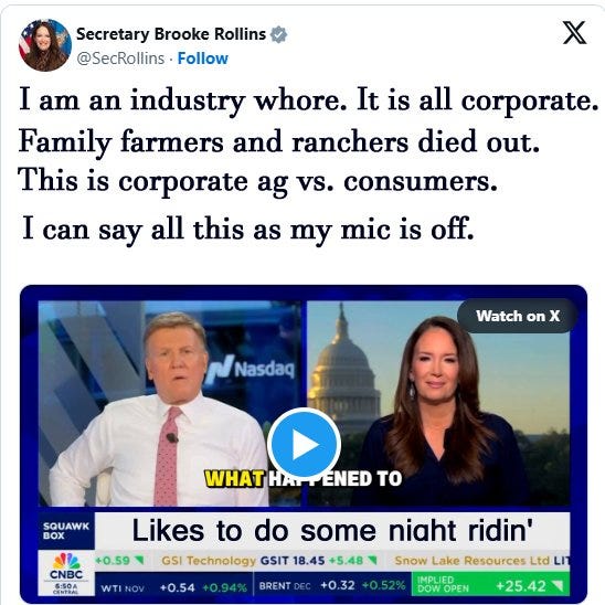 This has nothing to do with consumers or family farmers. Most of the family types died out around 2000 AD in the year of our Lord. What you got now are corporate farms run by people with the same name and that wonder of modern USDA in welfare farmers, like my asshole neighbor who has a Corvette, just bought a new combine at 70 years old, which you paid for on ag payments. Same shit with Trump’s soybean bailout at 14 billion. That is not for farmers. That is going to pay the costs to corporate Big Oil, John Deere equipment, fertilizer, Monsanto and Bayer crops. Let us get real in the money flow and stop the Goddamned obfuscation in this dirty reality of corporate welfare ag which turns out poison food.
